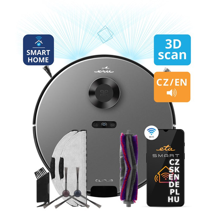 Az ETA Aurum robotporszívó az Ön nyelvén beszél. A cseh nyelven kívül beállíthat angol, lengyel, német vagy francia nyelvet is. Emellett kompatibilis az Amazon Alexával és a Google Asszisztenssel is, így szóban is adhatunk neki feladatokat.