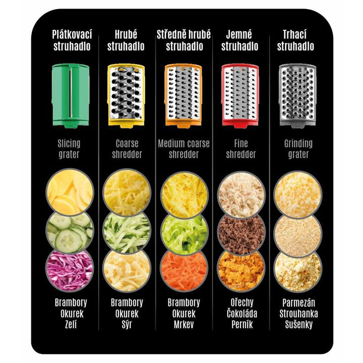 • Tartozékok: finom, közepes és durva reszelés, szeletelés, kemény sajtok és zsemlemorzsa