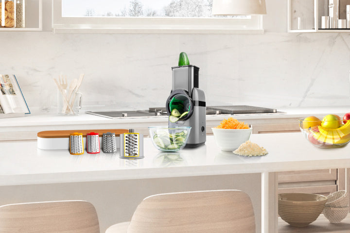 Elektromos reszelő 5 cserélhető fejjel reszeléshez és szeleteléshez, DC motorral. Kompakt méret, könnyű használat.
