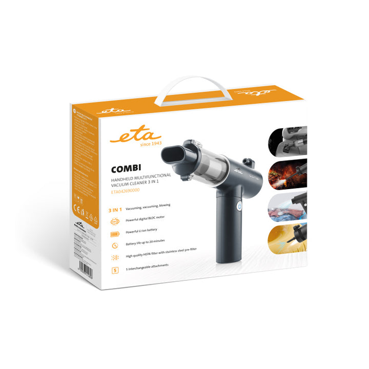 Ez az ETA Combi 3 az 1-ben kézi multifunkciós porszívó sokkal többre képes, mint pusztán porszívózni. A különféle tartozékoknak és a fújófunkciónak köszönhetően képes port lefújni, napozóágyakat vagy labdákat felfújni, sőt vákuumzsákokból levegőt kiszívni. Könnyű, kompakt, egyszerűen kezelhető, és kényelmesen elfér akár egy fiókban is. Ideális segítség otthonra, autóba vagy utazáshoz.