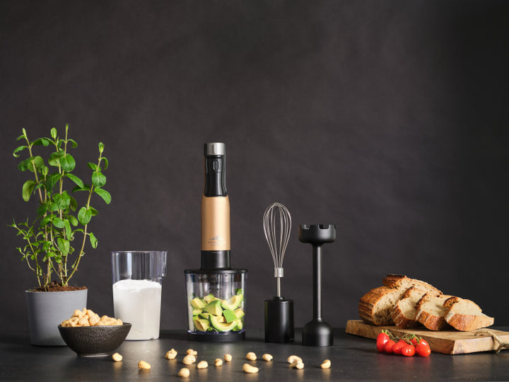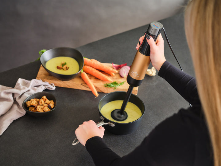 Erőteljes botmixer DC motorral, 1000 W teljesítménnyel, elegáns fényes fém kivitelben, gazdag kiegészítőkkel.