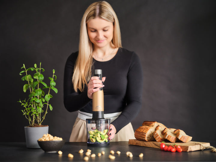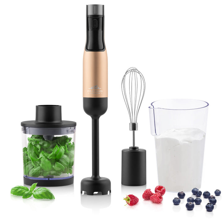A csomagban talál egy praktikus aprítót is éles, kasza alakú pengével, amely könnyedén megbirkózik a keményebb alapanyagokkal, mint a diófélék, zöldségek vagy gyümölcsök. Szeretne hagymát, fűszernövényeket aprítani vagy házi pestót készíteni? Semmi gond! Ez a botmixer minden kulináris kihívásra felkészült.