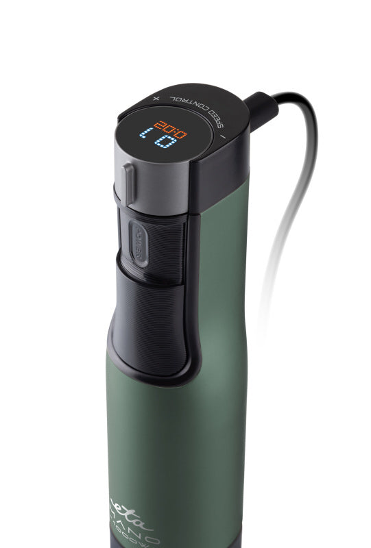 Az ETA Mano mixer modern LCD kijelzővel van felszerelve, amely megjeleníti az aktuális sebességet és a működési időt. Ennek köszönhetően teljes átláthatóságot biztosít a munkafolyamat során, és mindent könnyedén az igényeinek megfelelően testre szabhat. Ez az okos részlet új szintre emeli a főzési élményét!