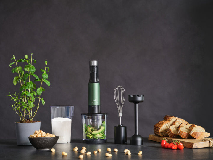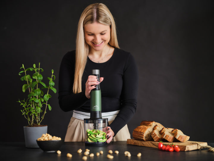A csomagban talál egy praktikus aprítót is éles, kasza alakú pengével, amely könnyedén megbirkózik a keményebb alapanyagokkal, mint a diófélék, zöldségek vagy gyümölcsök. Szeretne hagymát, fűszernövényeket aprítani vagy házi pestót készíteni? Semmi gond! Ez a botmixer minden kulináris kihívásra felkészült.